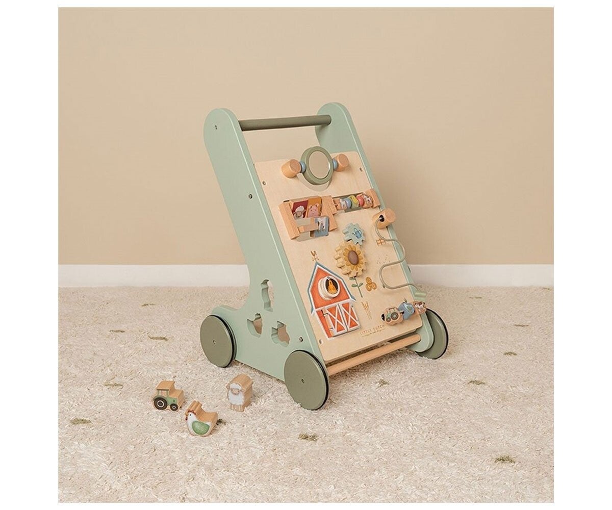 ¡Camina, juega y aprende! Este andador de madera ofrece diversas actividades desafiantes que fomentan el desarrollo de la motricidad fina de tu hijo. Desafíalo con las numerosas actividades de este andador bellamente decorado. Hay 8 actividades para descubrir y dominar. Encuentra a alguien en el granero y gira los bloques para completar los animales. Su diseño robusto lo hace ideal para que niños de 12 meses en adelante aprendan a caminar, listos para dar sus primeros pasos. Prepárate para animar a tu pequeño mientras se mueve fácilmente por la casa. Las ruedas de goma evitan que se raye el suelo. Debe ser montado por un adulto.