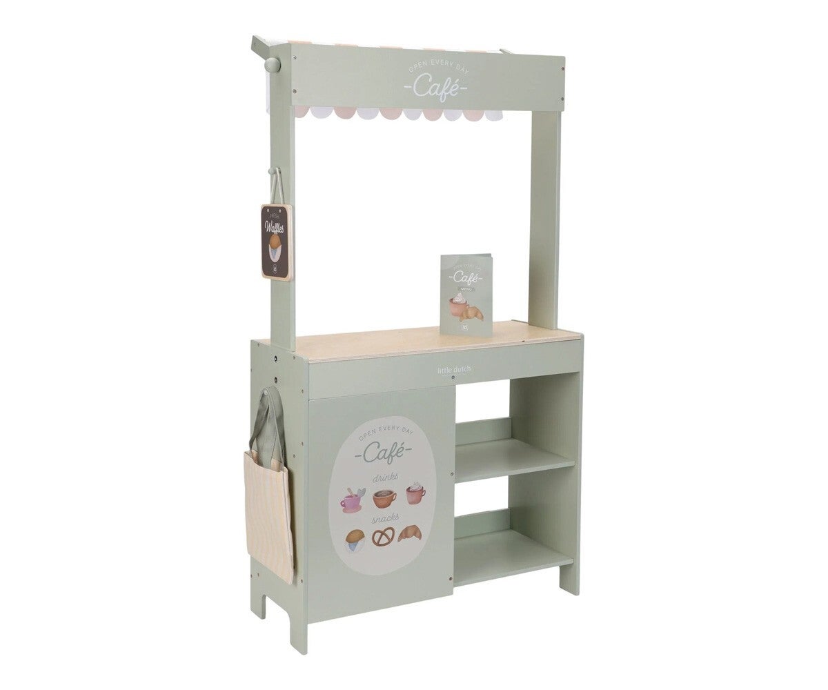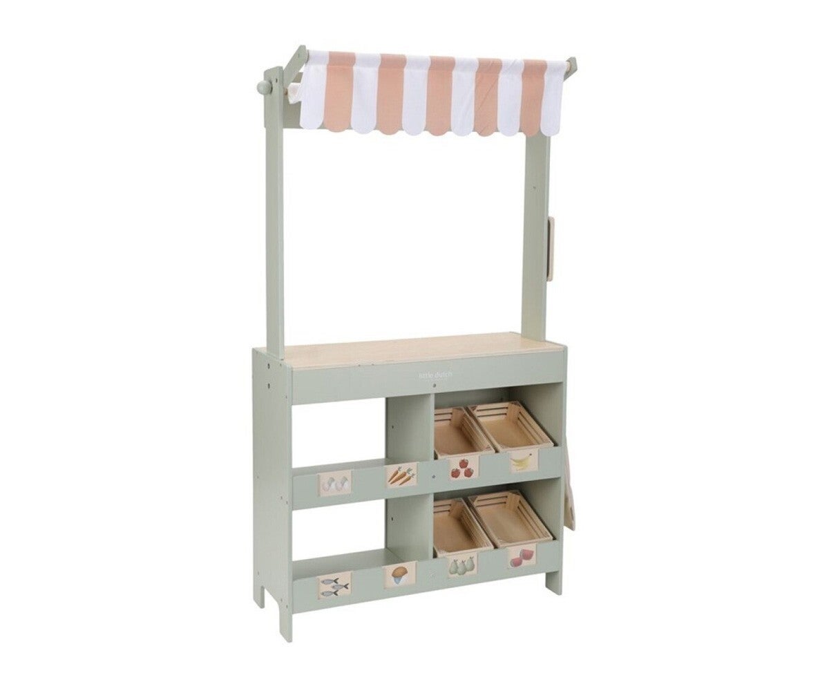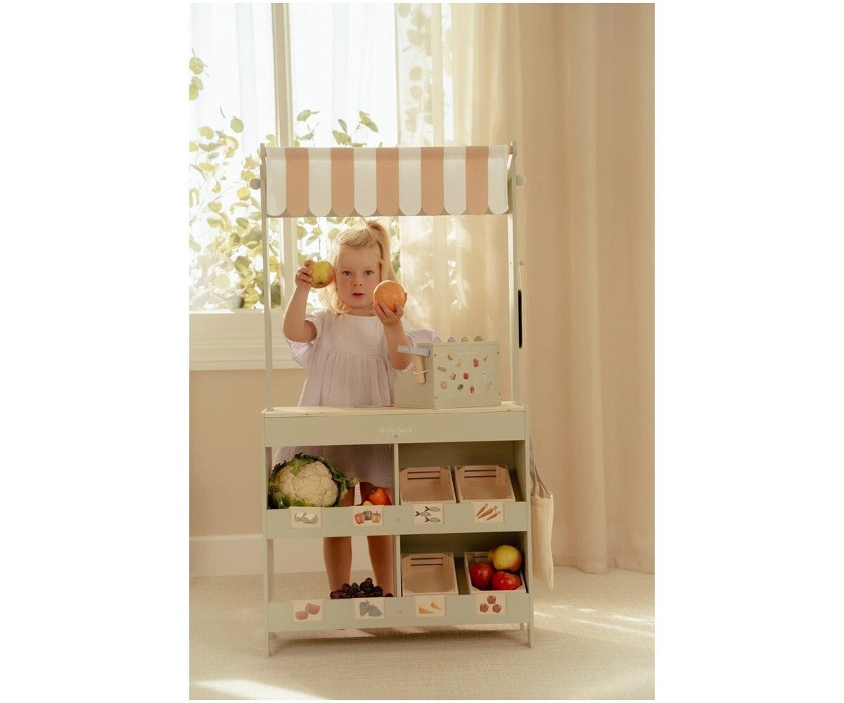 ¡Bienvenidos al mercado! Con este precioso puesto de madera, los niños pueden jugar a tener su propia tienda. La tela crea un auténtico ambiente de mercado y, con la pizarra y las tarjetas ilustradas, pueden exhibir los productos con elegancia. El set también incluye una bolsa de compra y cajas para una auténtica experiencia de compra. Dale la vuelta al puesto y se convertirá en una cafetería, con menú y alegres ilustraciones. Combínalo con la caja registradora, la báscula o el expositor de pasteles para disfrutar aún más jugando. ¿Qué hay en el menú de hoy?