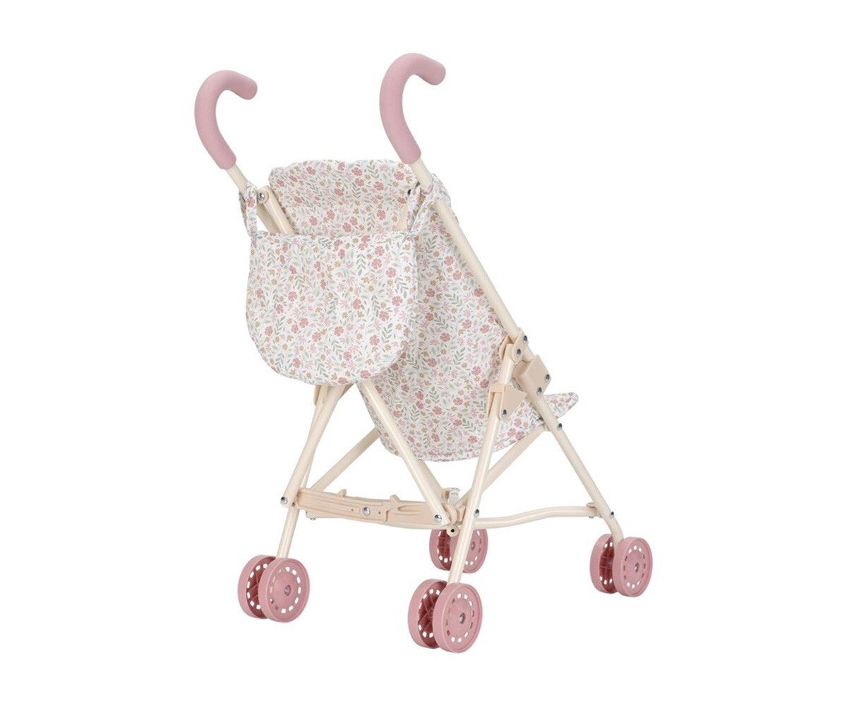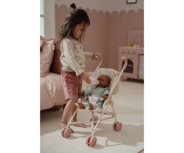 Este cochecito de metal para muñecas es perfecto para las aventuras de tu bebé. Con un robusto armazón en color hueso, detalles rosas y un asiento alegre, este cochecito no solo es práctico, sino también bonito. El cinturón de seguridad garantiza que tu muñeca se mantenga bien sujeta, incluso durante los paseos más aventureros. Una práctica bolsa de almacenamiento en el asa ofrece espacio para los accesorios de la muñeca, para que tengas todo lo que necesitas para un día genial con tu muñeca.