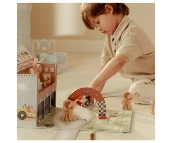 La Caja de Juego con Pista de Carreras de Little Dutch es mucho más que un estuche: se transforma en una pista completa donde los más pequeños podrán organizar sus propias competiciones.