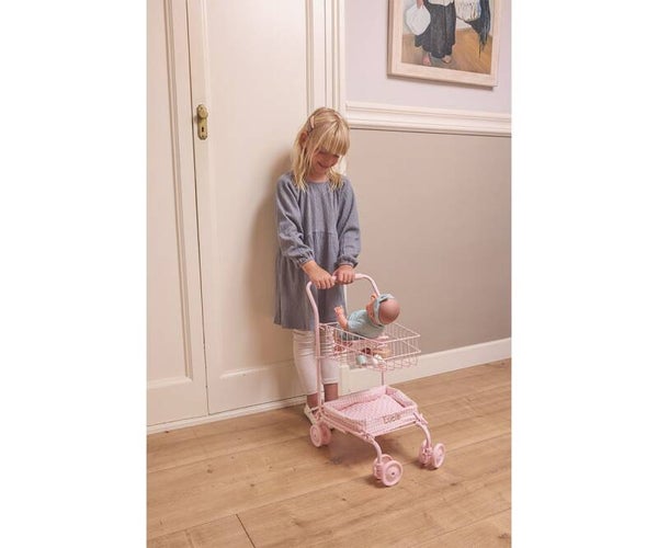 Su estructura robusta de hierro incluye una cestita superior de gran capacidad, un asiento integrado para muñecos y una práctica bandeja inferior de tela, ideal para almacenar todos los productos del supermercado infantil. Las ruedas delanteras giratorias y el mango acolchado garantizan un manejo cómodo y seguro durante el juego.