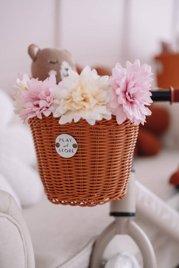 La cesta, fabricada con un 95% de ratán de plástico y un 5% de poliuretano, es ligera y duradera, ideal para transportar pequeños juguetes o accesorios durante los paseos.