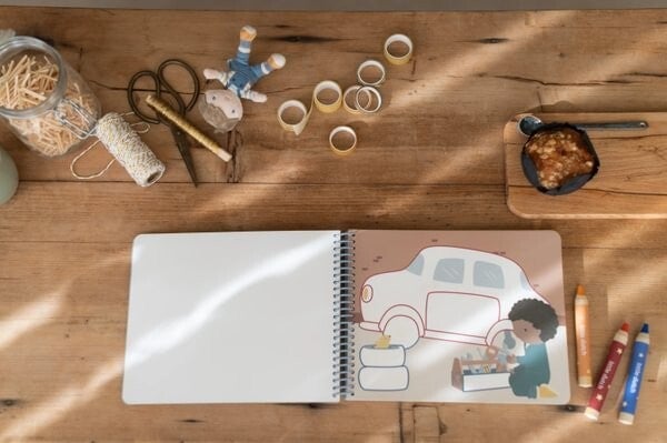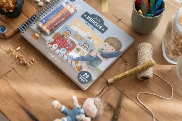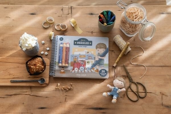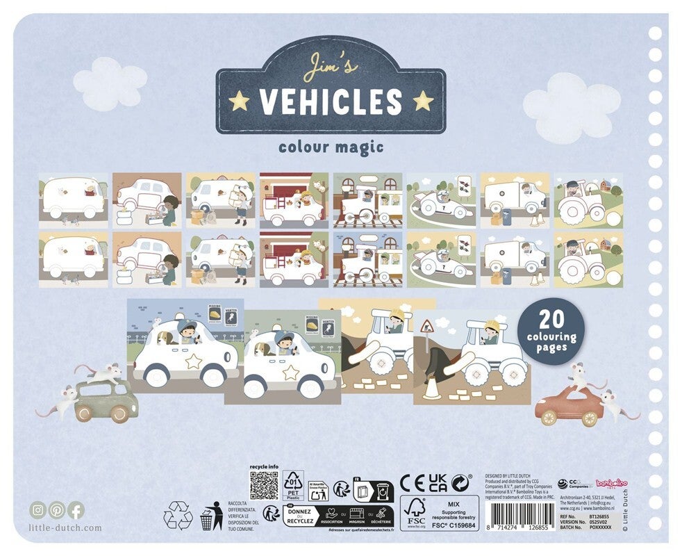 Libro mágico inspirado en el mundo de los coches del muñeco Jim, incluye lápices de colores de madera, 20 páginas impresas y 10 páginas en blanco.