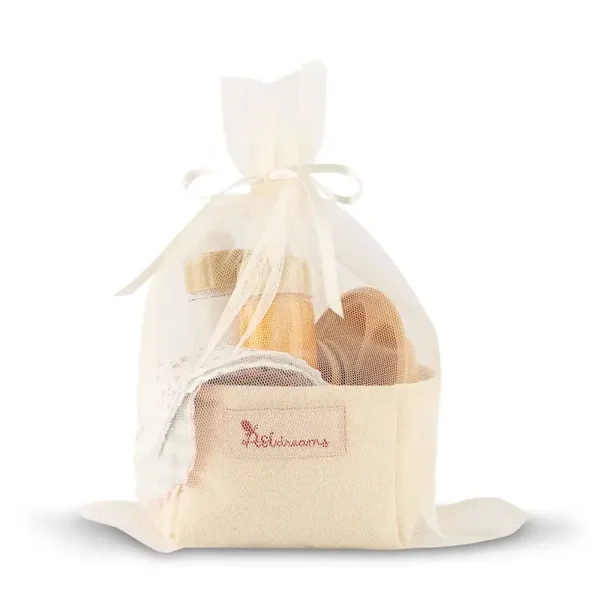 Con este encantador set de comida para muñecos, los pequeños podrán disfrutar de juegos más realistas y divertidos. Diseñado para muñecos de 36 a 46 cm, incluye un plato, cubiertos, dos baberos con diferentes estampados y dos biberones mágicos: uno con zumo y otro con leche. Todo se guarda en una cestita de tela y, para un toque aún más especial, se presenta en una bolsa de tul, ideal también para regalar.